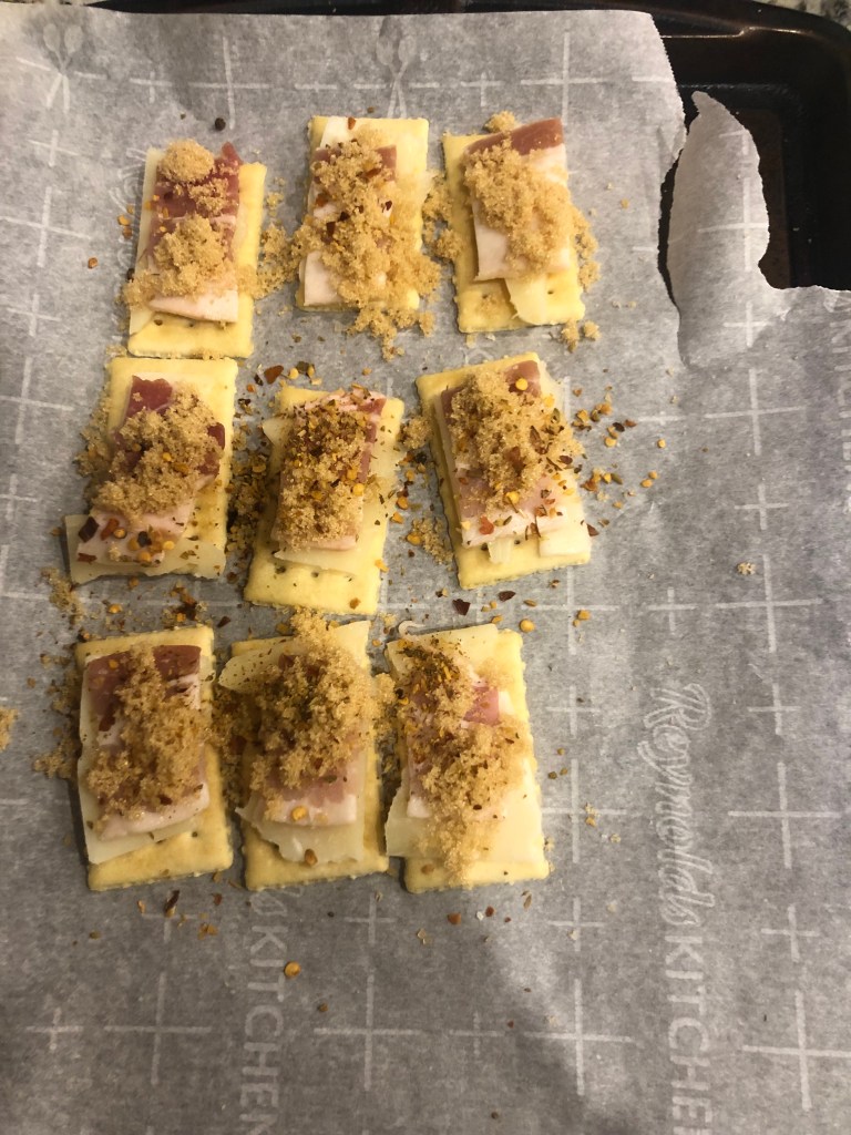 This blog is concerned that bacon will not be represented at Super Bowl parties. In an effort to support bacon and higher cholesterol, I have put my spin on a trending internet video. A simple cracker, bacon, parmesan cheese, brown sugar, and some everything Italian seasoning. Smokey, savory, sweet, and spicy all in one bite. I hope you like it. And please, cut to the coaches more than Taylor. I hope you like it.