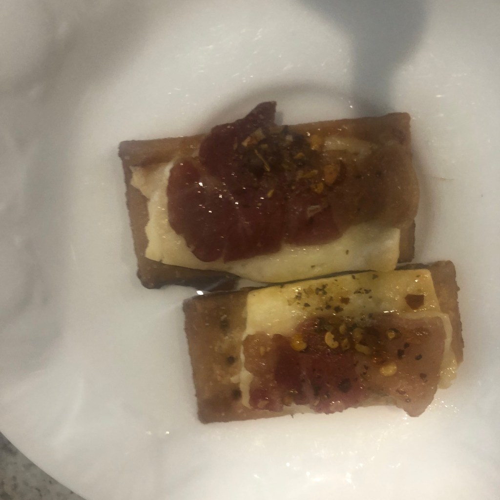 it looks like another 2 snacks: bread with tomato and bacon/ watermelon. one from Barcelona, another from Florence.