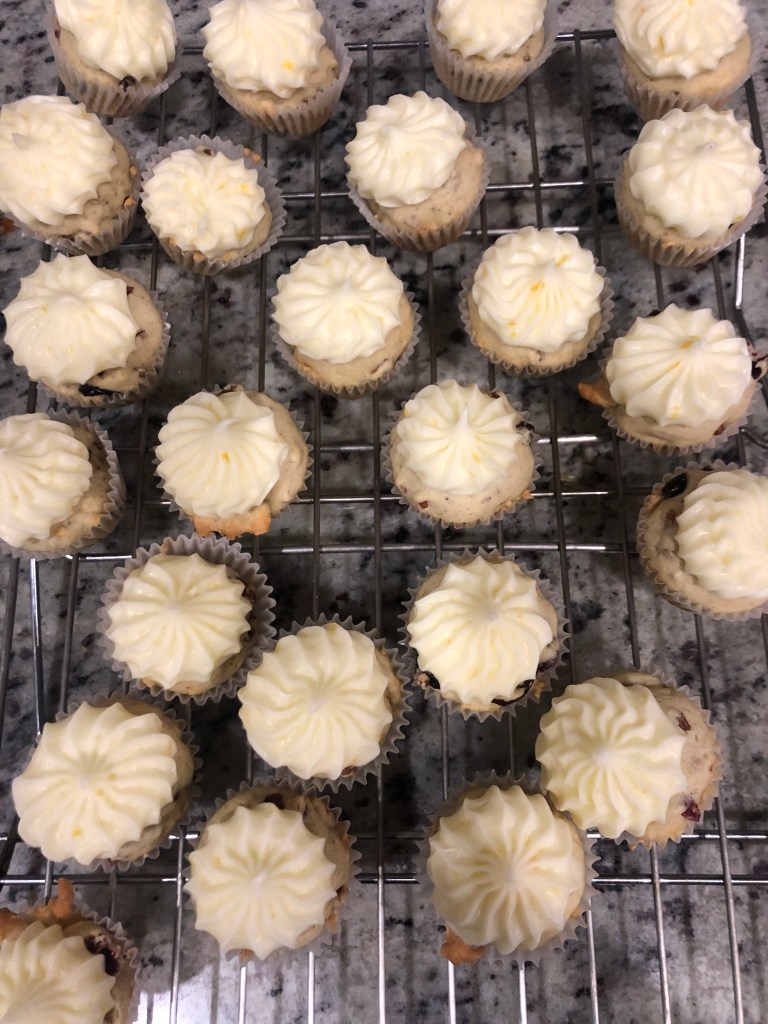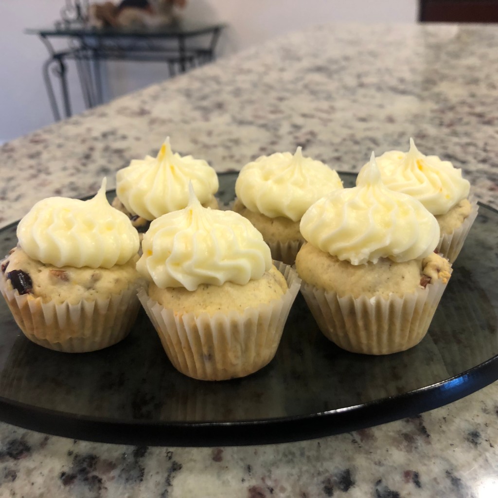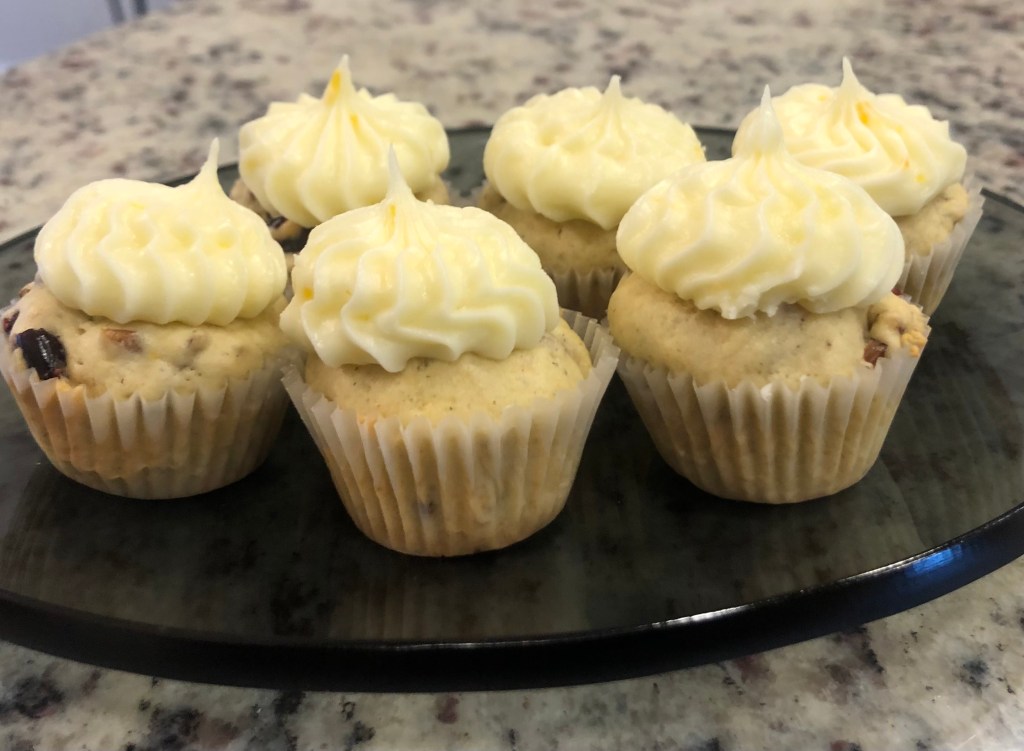 Think of a cupcake and a muffin having a baby: not as heavy as a muffin, not as light as a cupcake. Also, why does everyone forget about the cranberry after the holidays? The only place to find them is in the dried fruit or the frozen section. I used dried cranberries. The pecan tip is always toast your nuts. Cardamom ties the orange flavor to the cranberries. Last tip: don’t over mix your batter. I hope you like it.