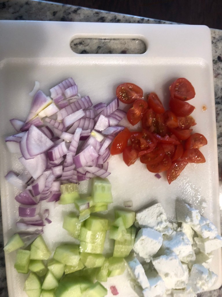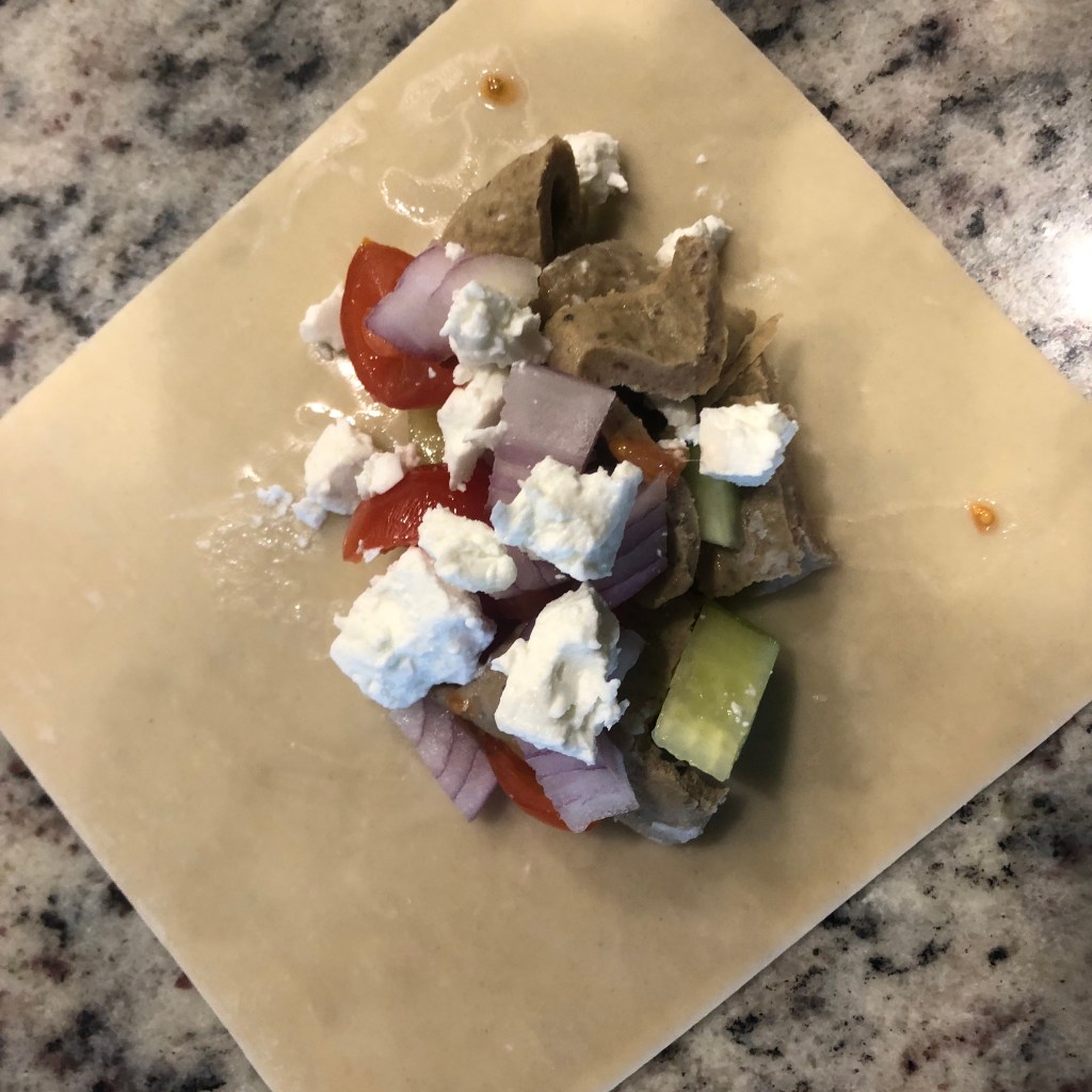 Followers of this blog may remember that my Aunt Margie and Uncle George had a restaurant in Greektown Detroit. I found some gyro meat in bulk quantities at Costco, so I plan on doing a number of Greek inspired recipes. Kinda like when I binged on cookie butter and elderflower syrup. So, a gyro egg roll must have tomatoes, lettuce, feta, cucumber, red onions, gyro meat, and a tzatziki dipping sauce. Now, I added some fresh mint and air fried these crunchy. Here is a warning: let these cool a couple of minutes coming out of the fryer or serious mouth burns will happen. I hope you like it.