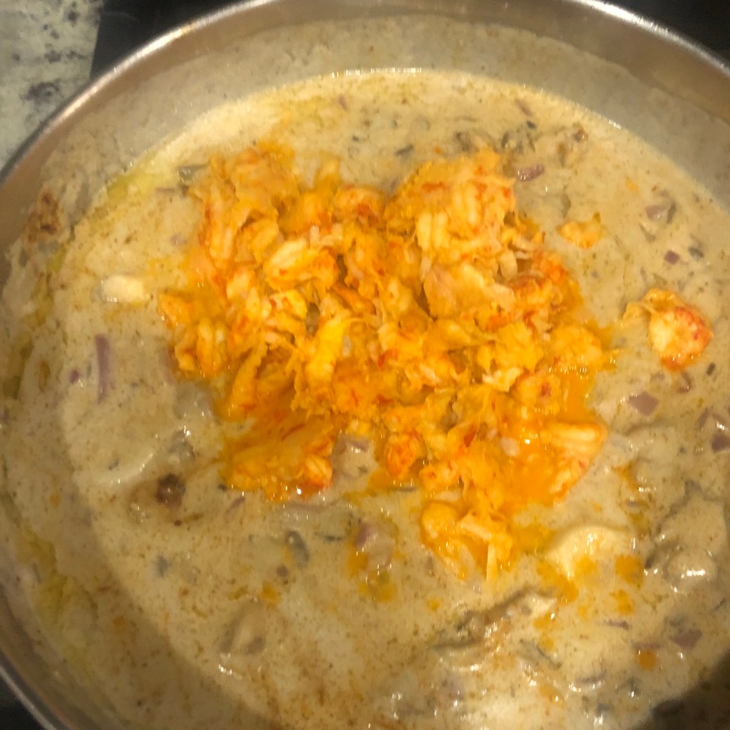 After fish has cooked 10 minutes, add milk, parmesan, and crayfish tails to mushroom sauce.