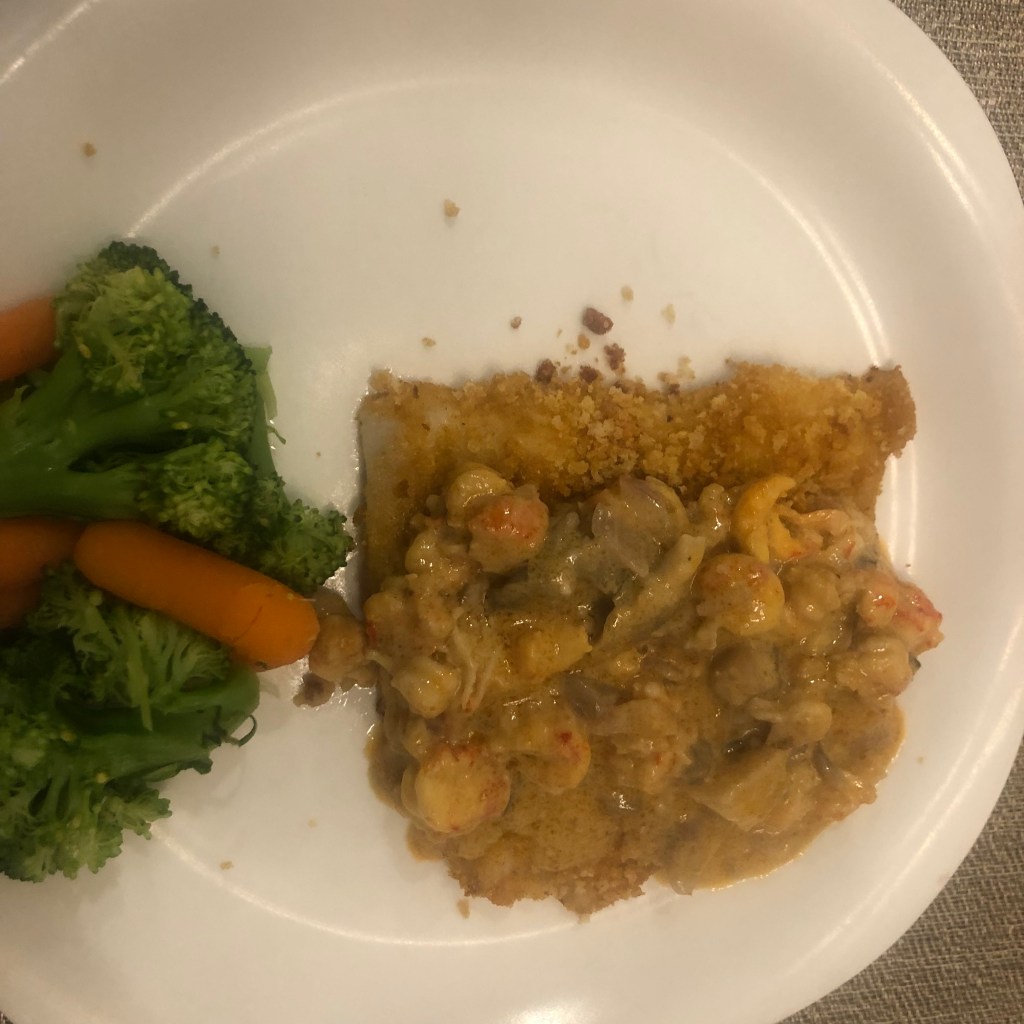 This dish is inspired by a Low Country beach trip. Flounder is fresh, plentiful, and inexpensive, and since fresh crawfish are only available a couple of months a year, frozen works just fine. I was also able to find some no sodium cream of mushroom soup to act as the base for the sauce. The rest of the components are onion, garlic, mushrooms, wine, parmesan cheese, and Shake and Bake mix, extra crispy. What? It makes a crunchy crust that holds up to the mushroom/crayfish sauce or you just have a wet mess. I hope you like it.