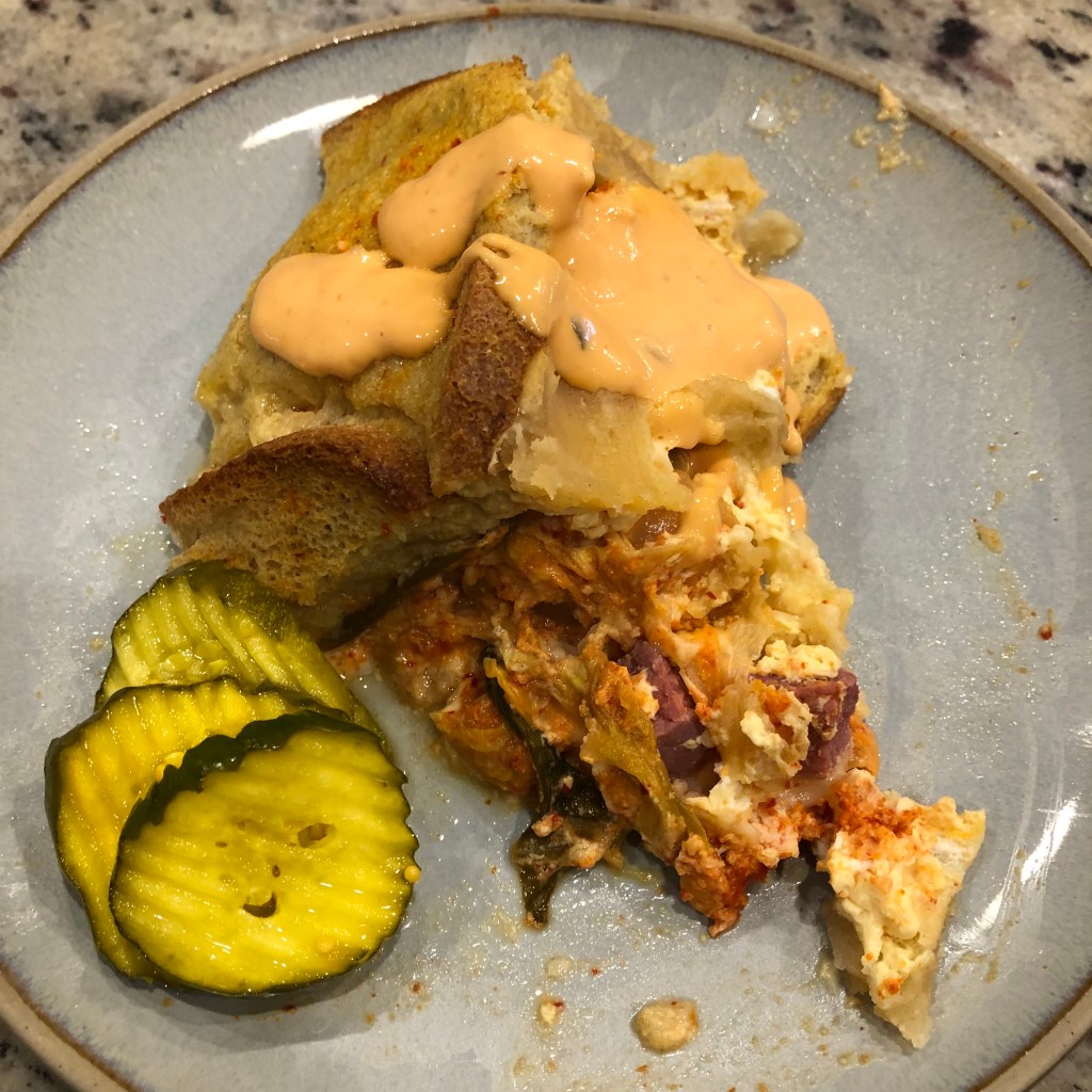 This is a way for me to use up St. Patrick day leftovers. There is the corned beef, the cheese, the cabbage in the form of kimchi. Topped with thousand island dressing and a rye bread French toast. I hope you like it.