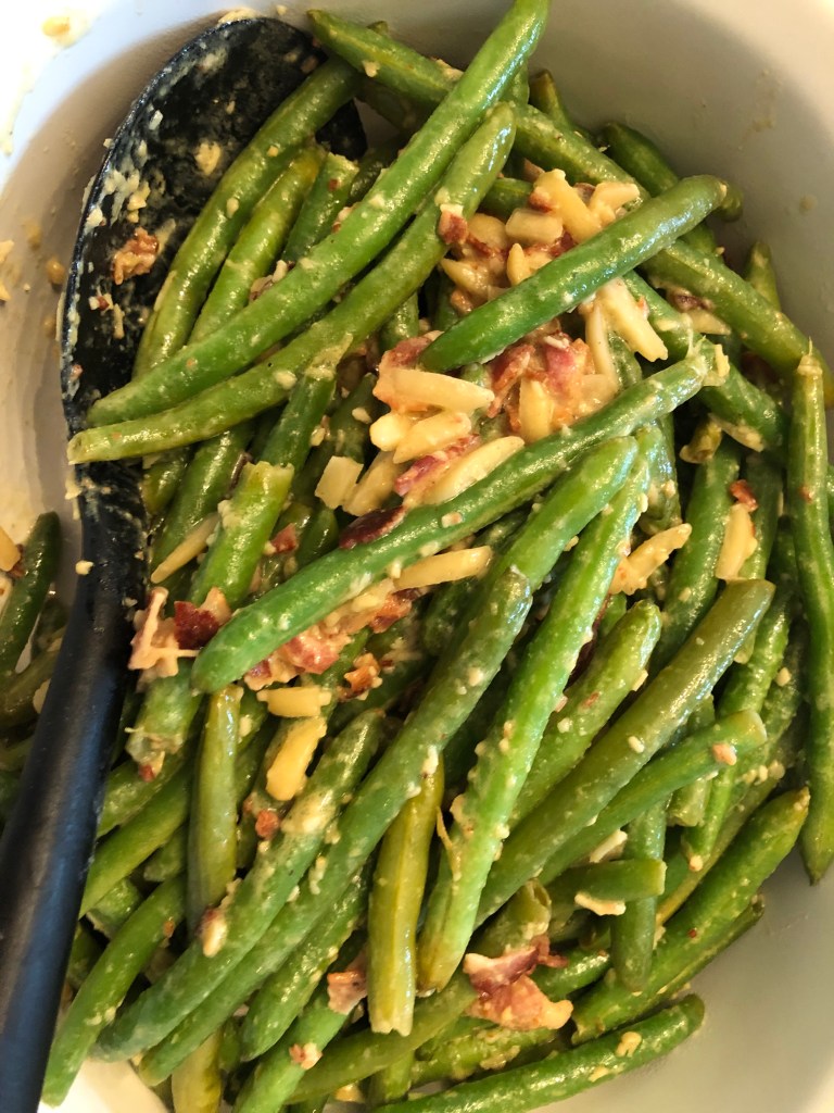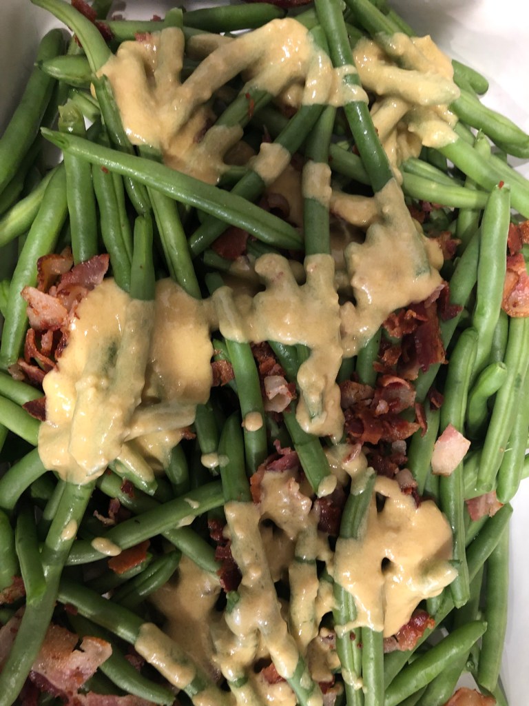 This is a different take on holiday green beans. Instead of the heavy mushroom sauce, we have a bacon mustard sauce which could be lighter if I wasn’t so heavy handed with the bacon. But it’s bacon, so I’m not asking for forgiveness or permission. The mustard breaks up the richness, and the lemon adds brightness. I hope you like it.