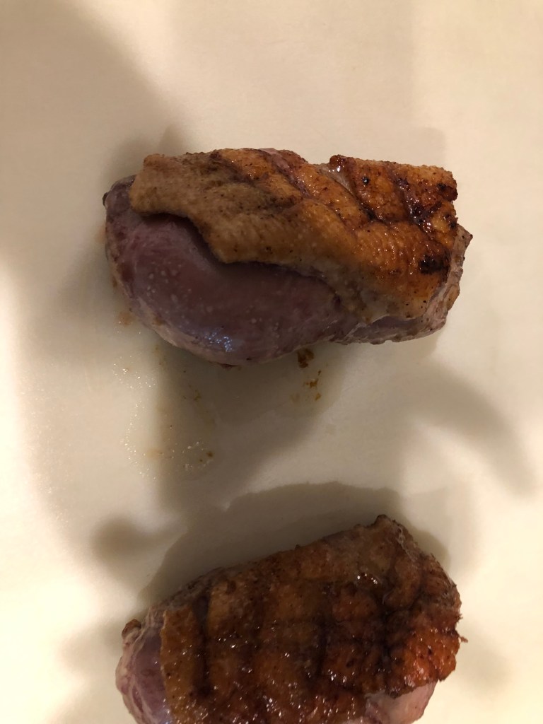 Add duck to pan, skin side down; cook until skin is brown, about 7-9 minutes. Turn over and cook for 5 minutes.
