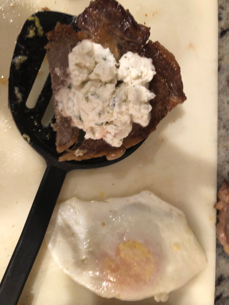 When I was a road warrior, I used to get drive-thru breakfast sandwiches all the time. You know the one. Now, the steak (that is an interpretation – it was beef) one was my favorite, but let’s be honest: it wasn’t a quality steak; it had American cheese and a pedestrian English muffin. While at the Warrenton Farmers Market, I noticed that Susie’s Scones had a savory cheddar and chive option. Now, you know where I’m going. We are going to give that old guy an update. I also got some chive goat cheese from Happy Creek Cheese to really send the flavor over the moon. I hope you like it.