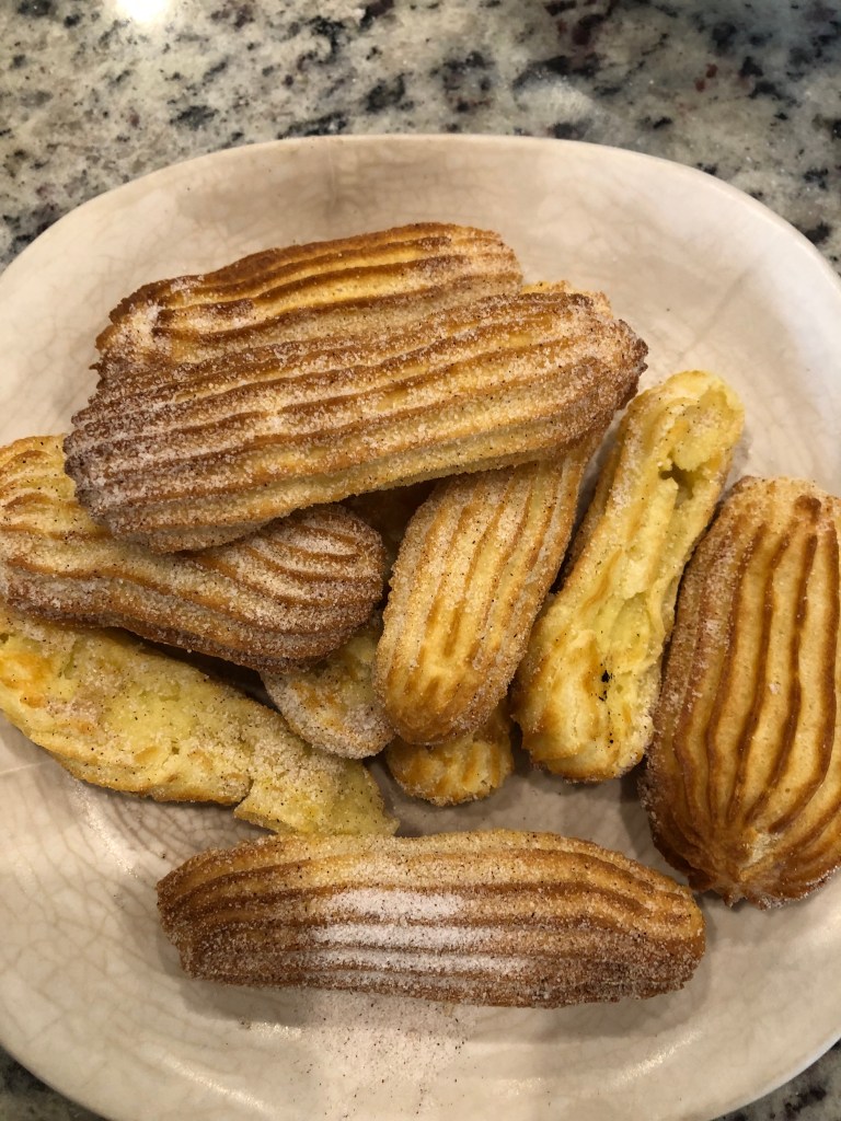 I enjoy a churro at the fair but don’t make them at home because of the messy oil. That is why I decided to try the air fryer. It worked, except I do miss some oil (the sugar doesn’t stick). I did give it a good spray of cooking spray. Now, the dough is very much like eclair dough. The recipe does make a crunchy passable churro. I hope you like it.