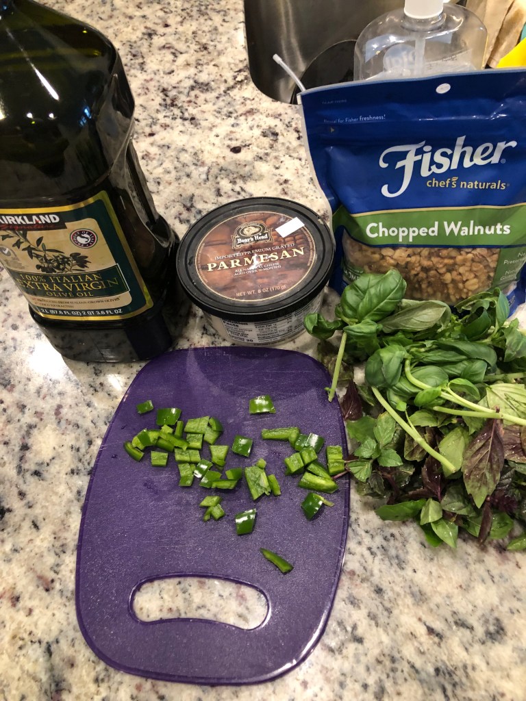 Mix jalapeño, walnuts, garlic, basil, and lemon juice in a blender. (You may have to add oil to blend.)