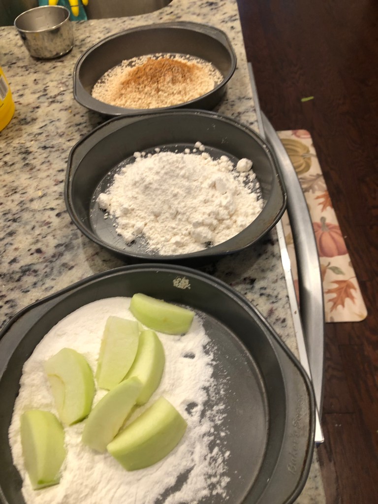 Dredge apples in rice flour right hand, then pancake batter left hand, then panko mix right hand.