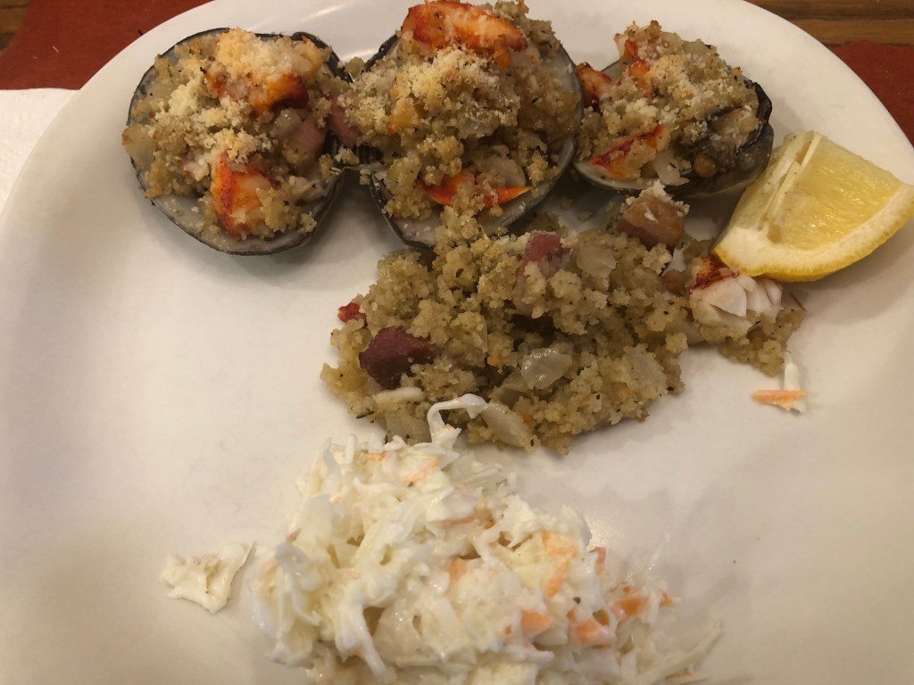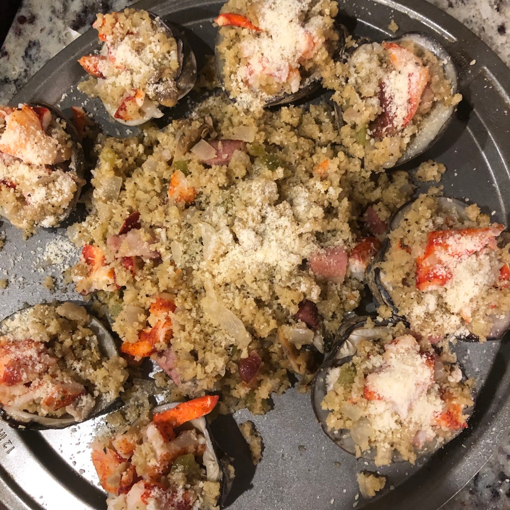 This one was going to be a riff on the classic clams casino then things went wonderfully wrong. I had some frozen lobster meat from a sale, so I got to thinking how I could use it. This dish is the result. The clams and lobster add sweetness and brinyness that are part of the dish. The wine and butter bring a richness that makes you want another bite. The squeezed-on lemon brightens the dish.