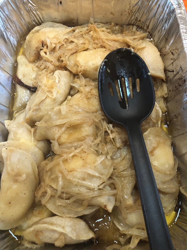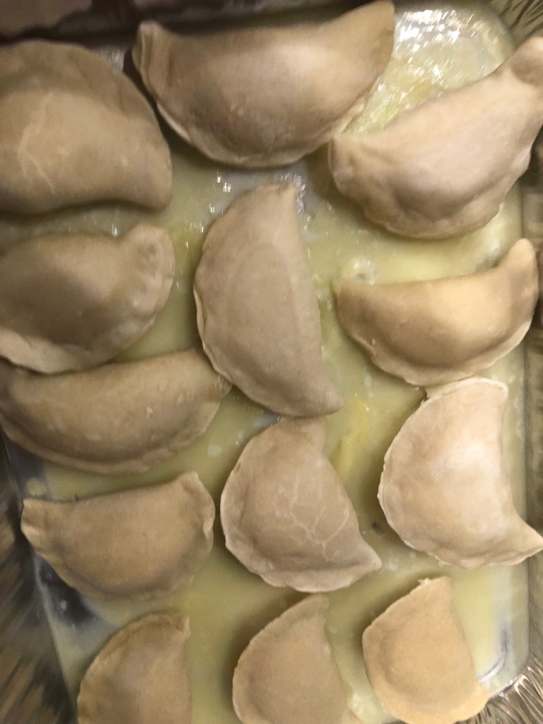 This was for a pot luck, and I had to make 3 dozen pierogi all at the same time. Baking was the only reasonable solution. How to impart a unique flavor: creole seasoning and butter with a whole lot of caramelized onions. I also did some special chipotle sour cream to really amp up the flavor. I hope you like it. Now, credit where credit is due. Tonya’s Ukrainian Yummies makes the best pierogi that I have ever had or at least in the last 40 years since I left Detroit. Thank you Tanya. Go to the Warrenton Farmers Market and try them if you don’t believe me. You won’t regret it.