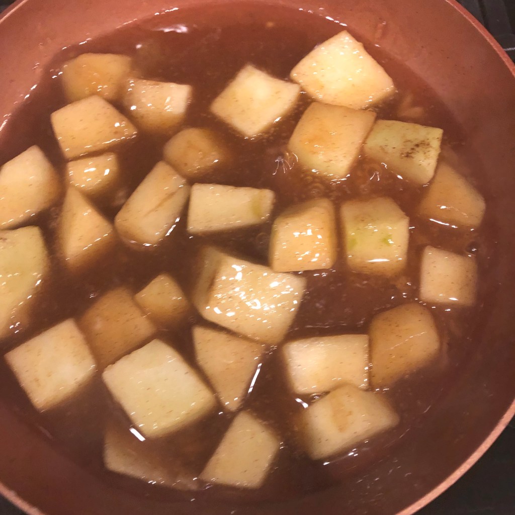 In a skillet on medium add apples, cider, brown sugar, cinnamon, and vanilla; cook for 10 minutes.