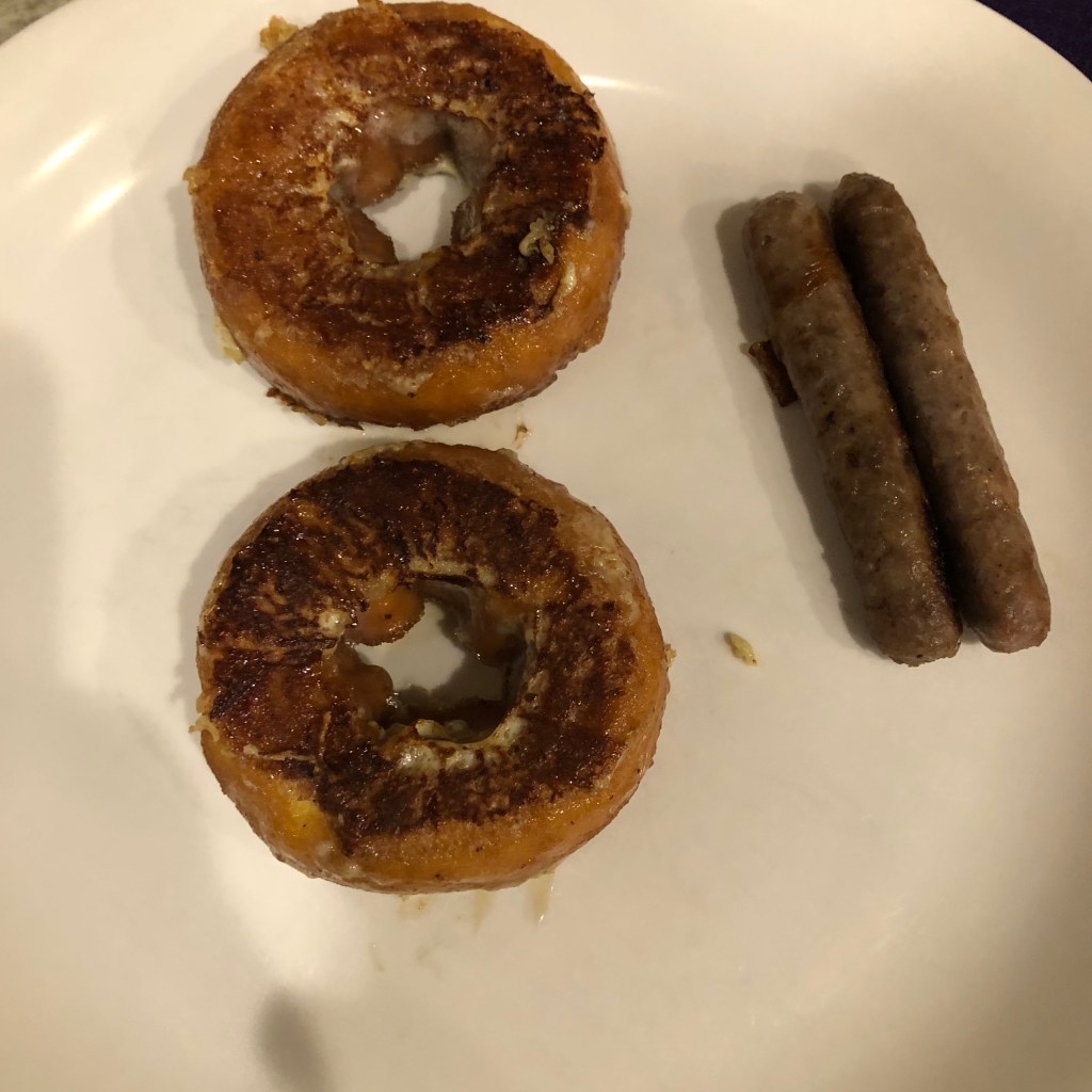 I feel empty calories are always the most fun. Who doesn’t love donuts, apples, and French toast.? All in one! This is like a fall trip to the cider mill while still in your pajamas. (Get that image out of your head.) I used a sour cream donut as the base, added some custard (milk and eggs), vanilla, bourbon, cinnamon, and cardamom. Then on the hot pan seared it to form a crust, topped with a cream cheese glaze. The apple topping absolve you of all guilt since apples will keep the doctor away. I hope you like it.