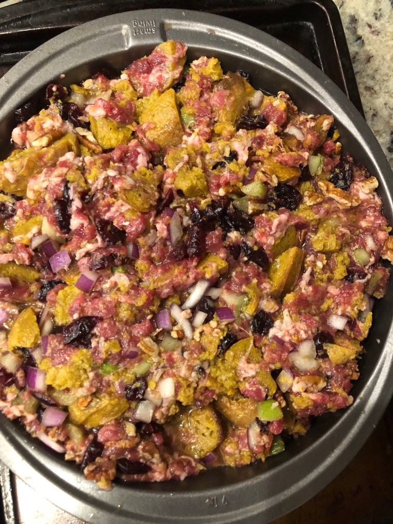 This screams Northern Midwest; if I had been able to find dried cherries, it would have been pure Michigan. (They were out of stock.) I started with a bread that screams of fall with pumpkin sourdough from Chunkers Bakery, then added some venison sausage from A to Z Butcher. I added the required onions, celery, dried cranberries, some spices, and a lot of chicken stock to keep it moist. I hope you like it.