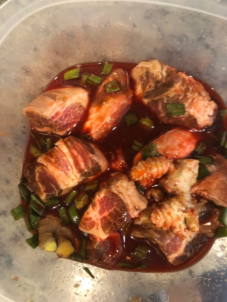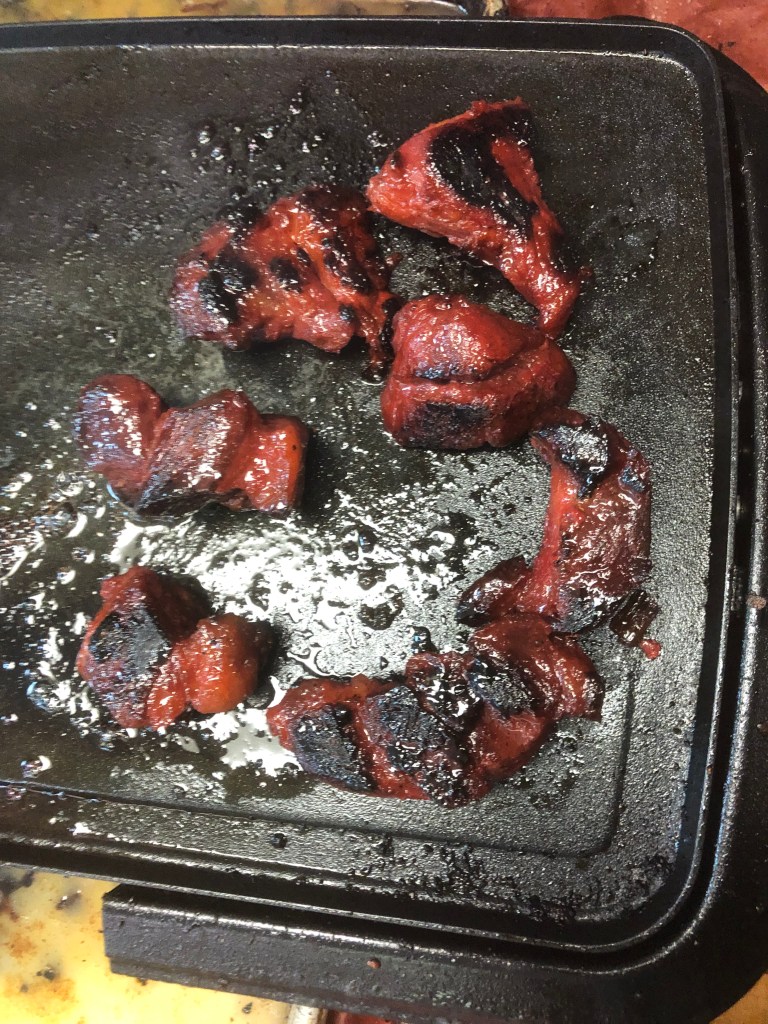 Comsomate Chinese BBQ pork collar but with changes. The classic has about a weeks worth of sodium. I used coconut aminos instead of soy to reduce the salt. I used hoisin sauce, ginger, 5 spice, garlic, green onion, rice wine vinegar and marinaded. Now in China they add red food color but doesn’t effect flavor so do or don’t add it . I got pork collar from A to Z butcher shop. I hope you like it.