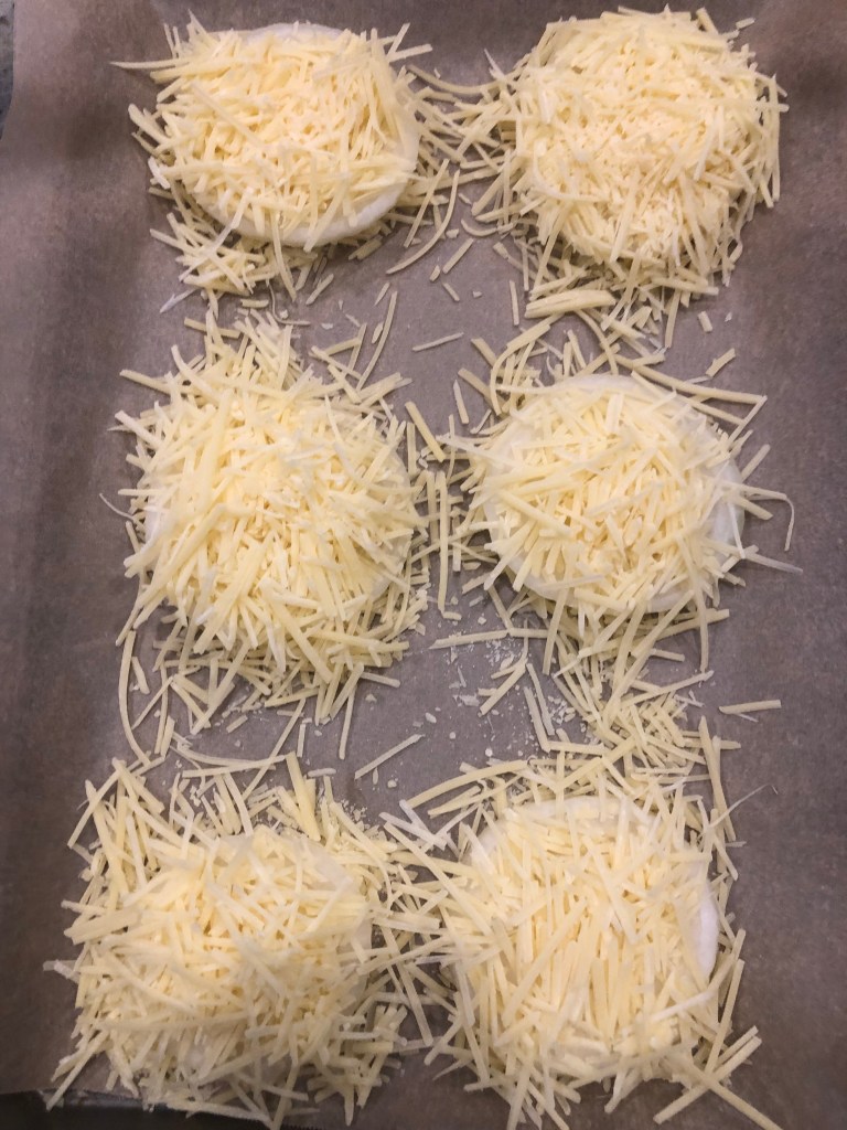 On a parchment lined sheet add 1 1/2 ounces of Parmesan cheese.