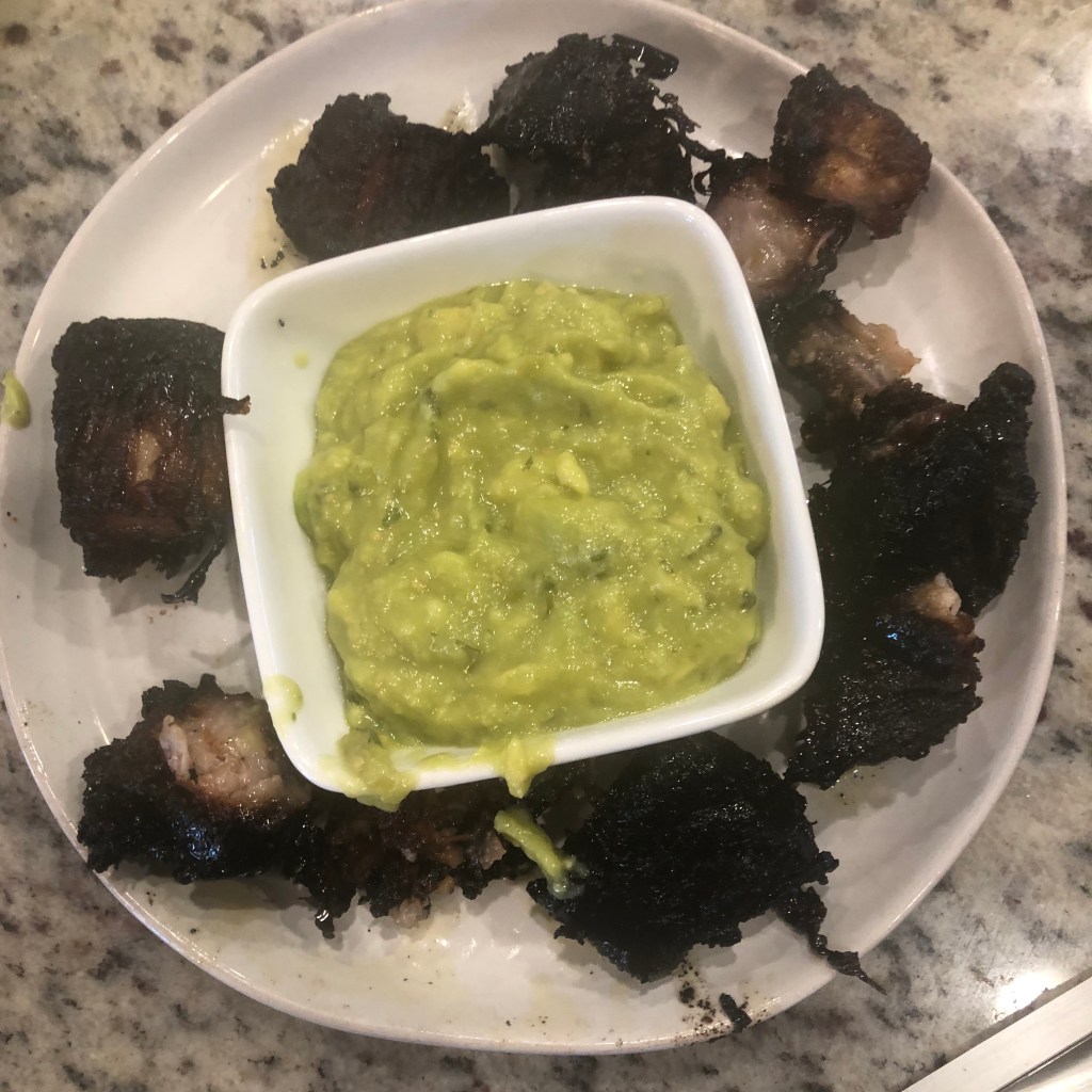 This is a long recipe and has a lot of elements and many steps, but the taste testers said it was worth it. Sure it was, they didn’t lift a damn finger. The break down is hot honey and smoked pork belly, smoked for 3 hours. Sticky, smokey, and spicy then dipped in guacamole which you didn’t see coming. I hope you like it.