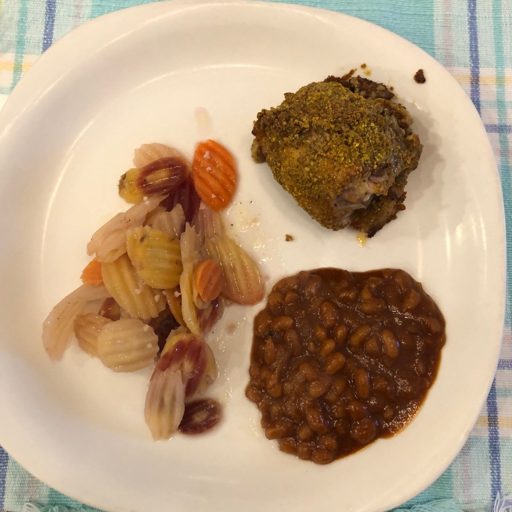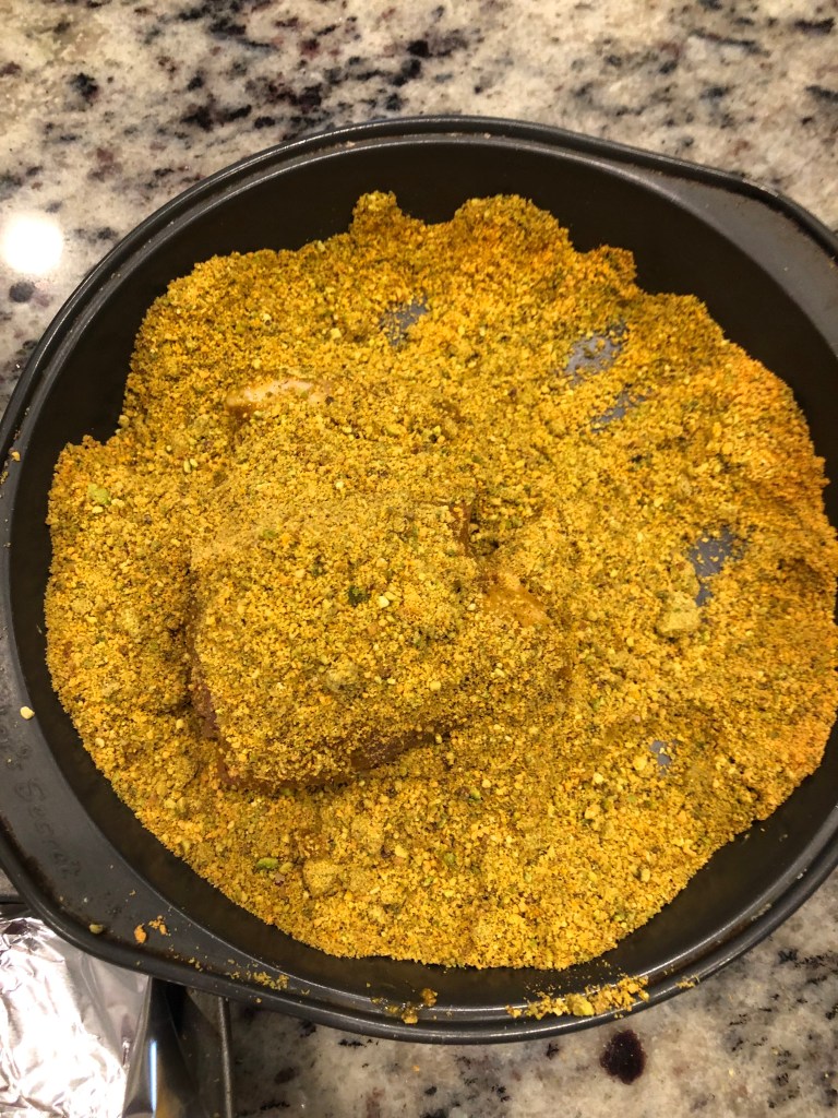 My brother Mike loves pistachios so I thought I would make a shortcut recipe for him. I combined the ground pistachios with a pack of Shake and Bake for a crunchy exterior. Now the flavor bomb part Dijon mustard, hot honey, vinegar and olive oil. I hope you like it.