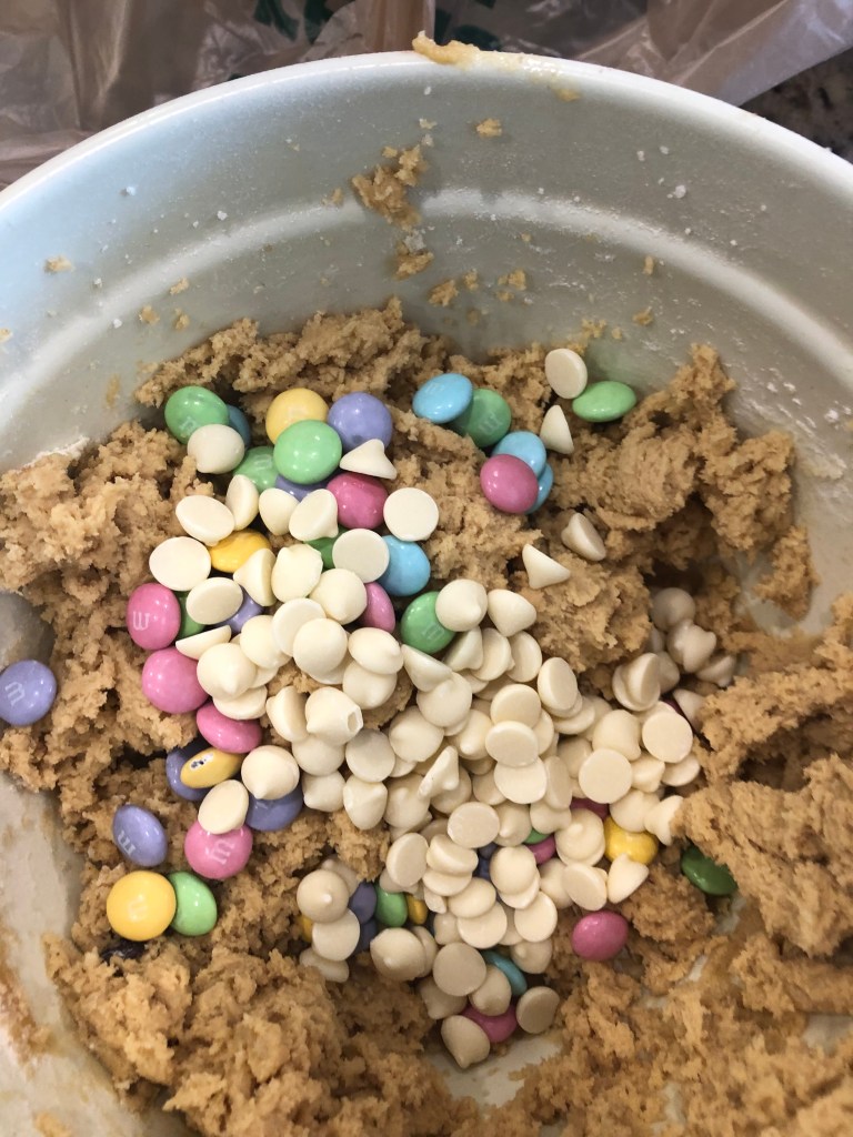 This is a flavorful cookie with goodies inside and out. Inside fireball, M & M’s, and white chocolate chips with a chocolate chip style dough. Outside is a little crispy edge with sprinkles. I know I don’t do pretty well, but this time I may have made the look nice on purpose. I hope you like it.