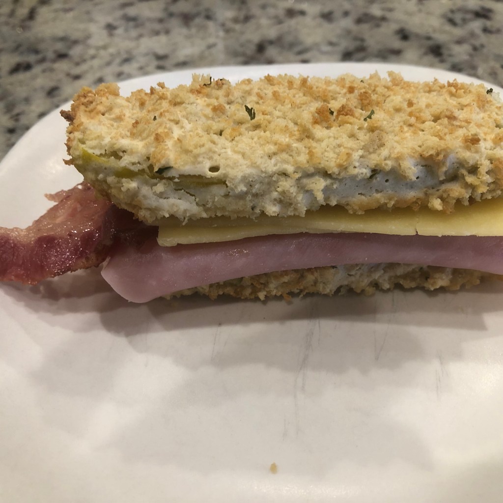 Pickle sandwiches are a hot food trend right now and I decided to do a version of it myself. In the traditional one there is a pickle cut in half stuffed with ingredients after the seed hèhave been removed. Mine is nothing like that. I couldn’t find a small jar of whole pickles just one that would last me two years. If you can find a local pickle provider see if they can help. So I breaded pickle planks added beef bacon ham and cheese and voila a pickle sandwich. Add whatever condiments you choose. I hope you like it.