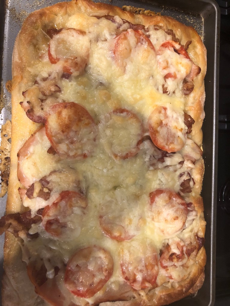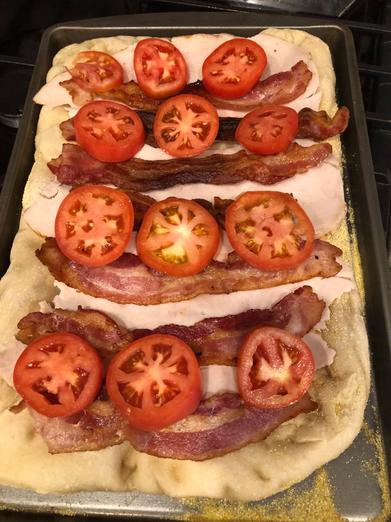 I did this in honor of the Kentucky Derby this year. I went to my first Derby in 1974 and had my first Kentucky Hot Brown sandwich that year. This is a homage to the sandwich. It has the major components turkey, smoky bacon, sliced tomatoes and cheese. The major changes are just three cheeses instead of the mornay sauce and a classic pizza crust no brioche. I hope you like it.