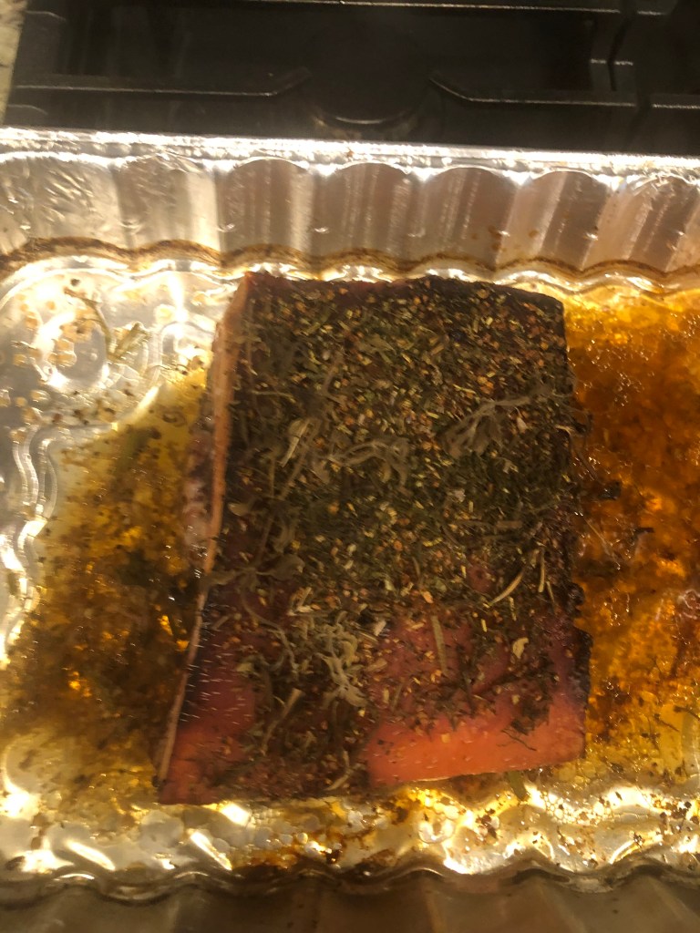 This is a British classic for weekend suppers. It is tender juicy with a crispy crackling on the top. The flavors of fennel, thyme, salt, pepper and just a little bit of sugar. It takes time so let it cook. Then on high heat, make the top crispy and delicious. I hope you like it.