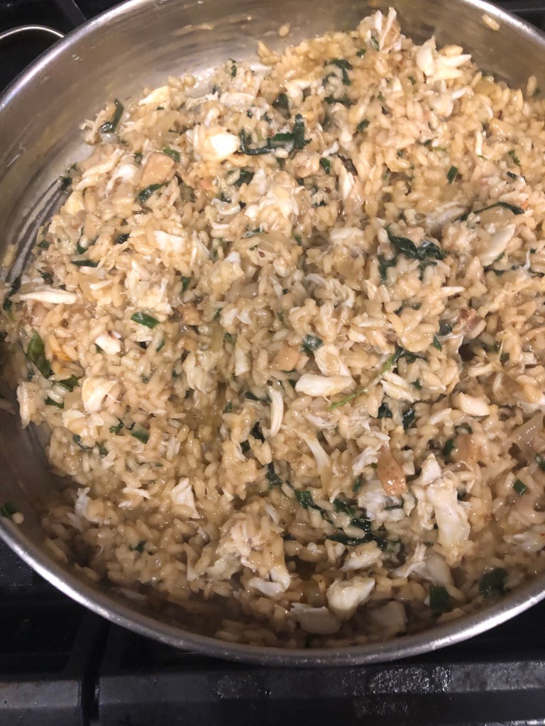 Saturday was a good day at the Warrenton Farmers Market. I was able to find golden oyster mushrooms from Waterford Run Forge; garlic chives and wood nettles from Happy Vibes Farm and crab meat from Logan’s 24/7 Seafood all in a risotto. Creamy, crabby, mushrooms and herbs. I hope you like it.