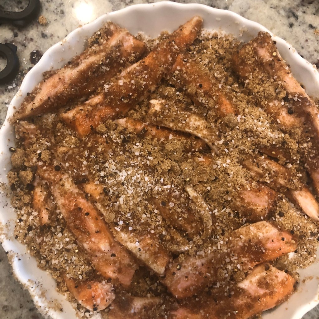 No it’s not really pastrami but it tastes like a fishy version. I used the fatty salmon belly and all the steps to make pastrami to make a delicious lunch meat. Kosher salt, brown sugar, cloves, peppercorns cardamom, and allspice. The salmon rests in n the spices overnight and is then smoked low for an hour. Fatty in the best way, spicy sweet and smoky. I hope you like it.