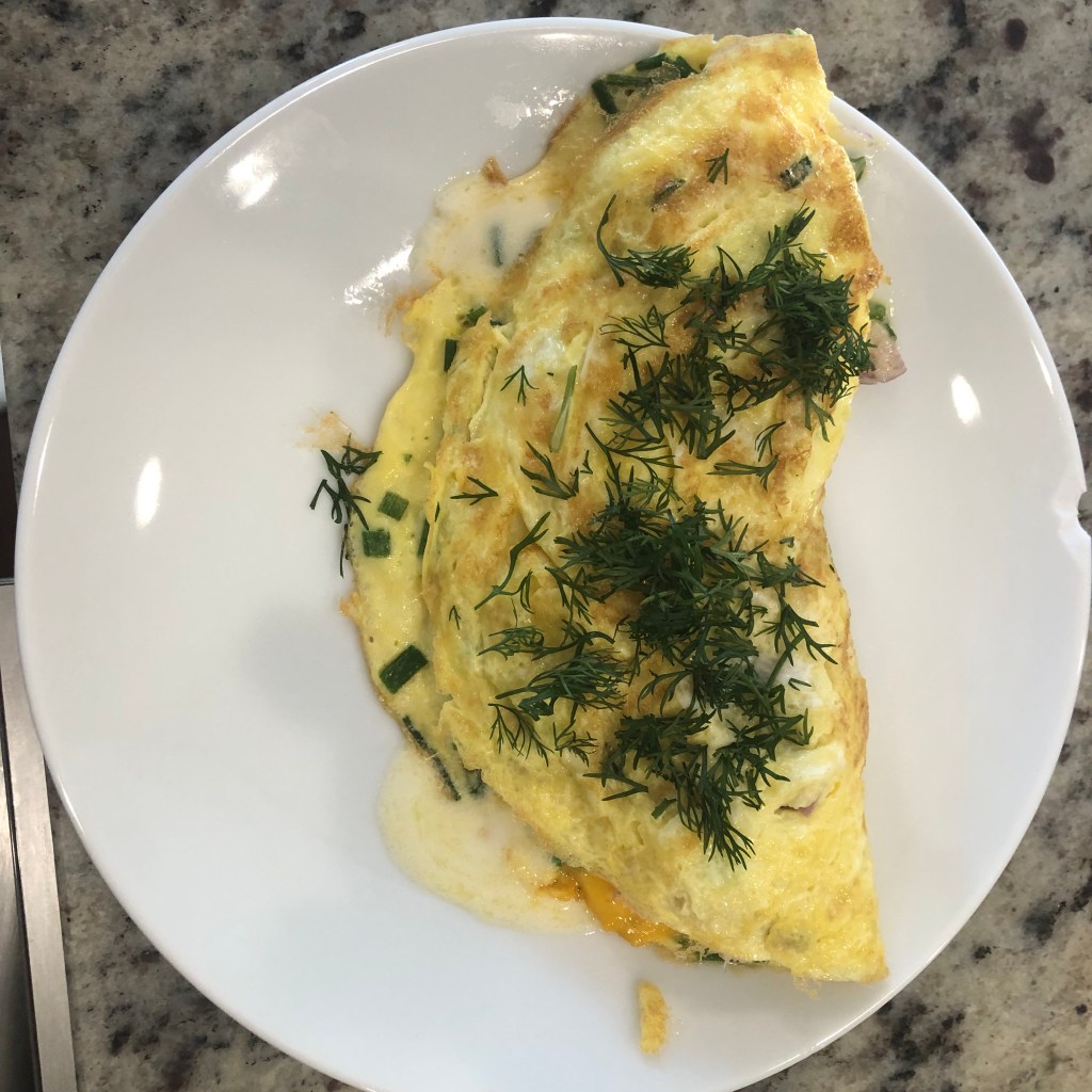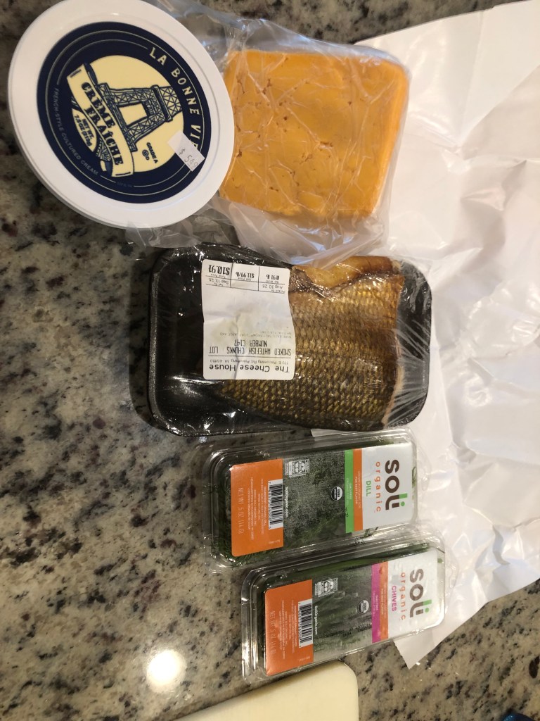 Here are some great flavors of the North country. Start with smoked whitefish, sharp Pinconning cheese, crème fresh, heirloom tomatoes and lots of fresh herbs. This is a perfect way to start your day while watching a ferry take off from the dock heading to Mackinac Island. I hope you like it.