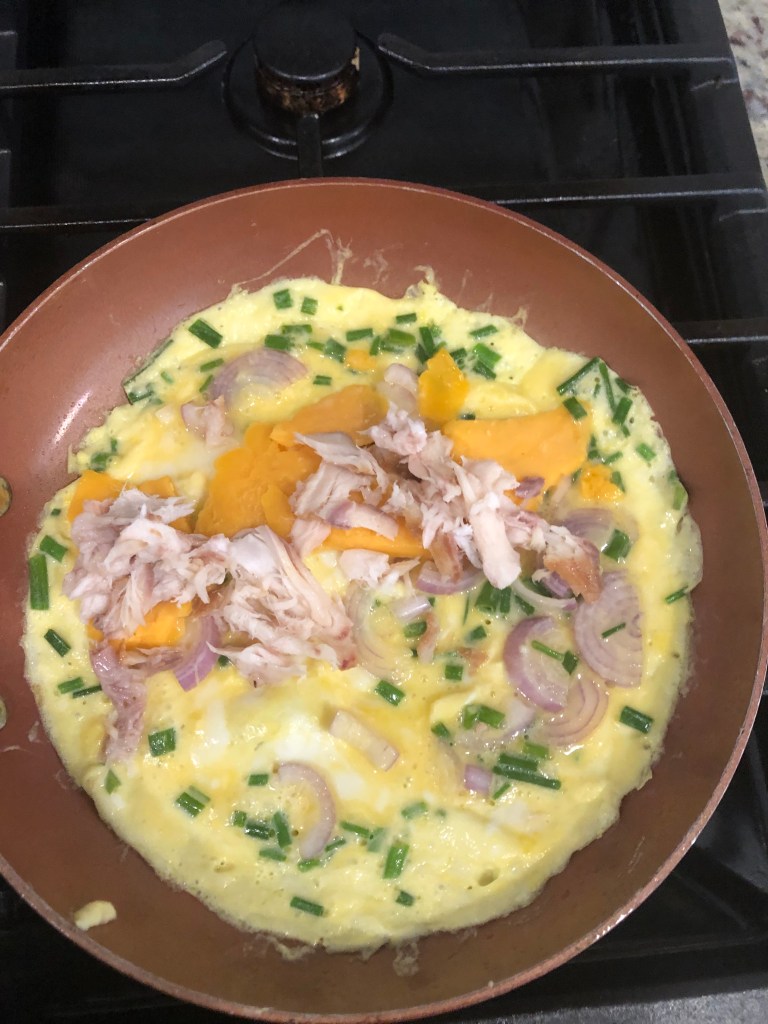 Add red onions, tomatoes, cheese, crème fresh and whitefish. Cook for 3 minutes.