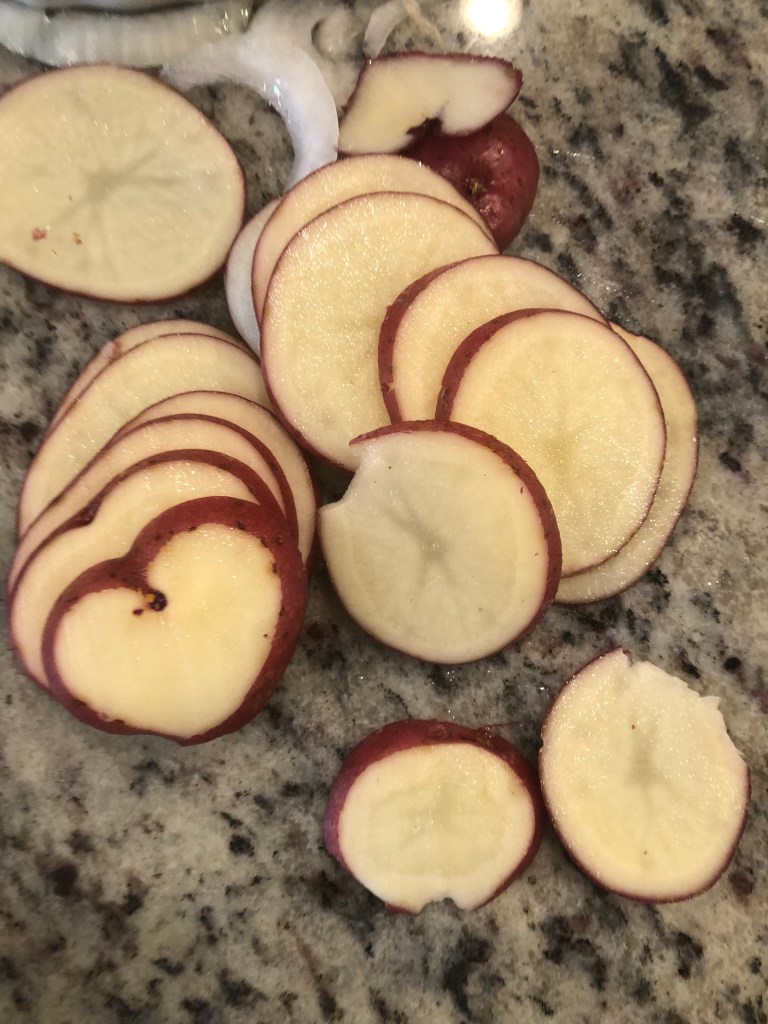 In a baking dish add a layer of potatoes overlapping part of each potato.