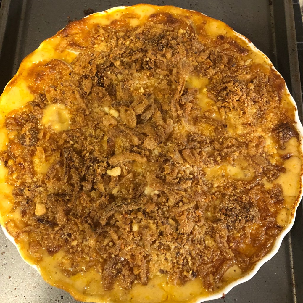 Remove from oven top with Parmesan cheese and fried onion mix.