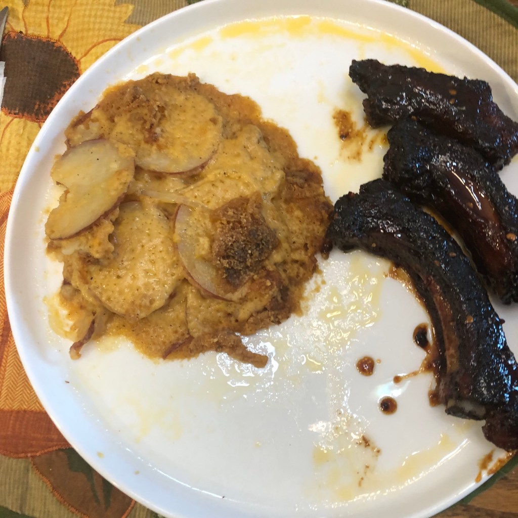 Let’s journey back to the old time dinner party where the hostess had seen that episode of Julia Childs where she made potatoes au gratin. Of course in my house that came in a box with Betty Crocker on it. So I have done my best to recreate a more classic version with some upgrades. First Pinconning cheese is the base flavor, potatoes as the backbone, smoked bacon and just enough hot sauce to tie it all together. So put on the plaid bell bottoms pour the cocktails and be ready to have jello 1-2-3 for dessert. I hope you like it.