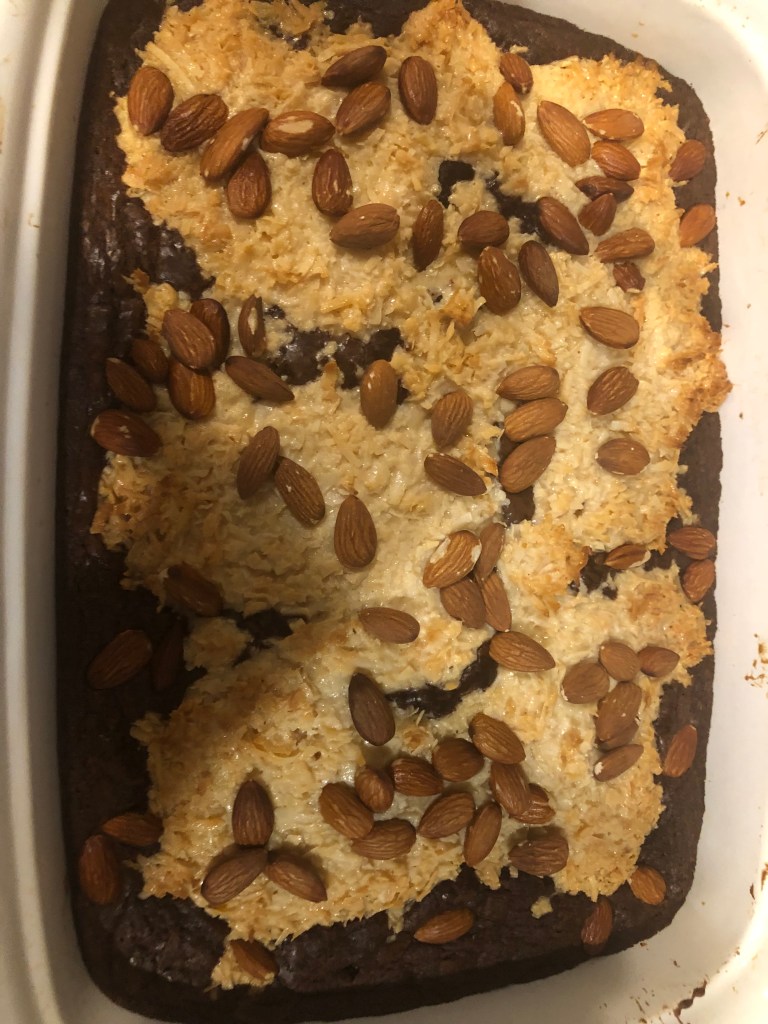 Bake for 12-15 minutes until coconut browns the almonds are toasted and brownies are cooked.