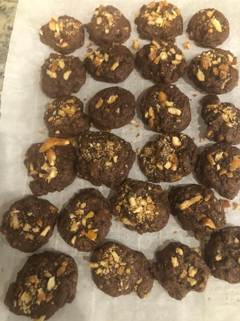 This is the result of spending too much time in the grocery store. I was walking the isles and saw cinnamon sugar pretzels and my Mad Scientist kicked in. I had a chocolate cookie mix at home and decided to pair those items. I broke the pretzels in pieces added some to the cookie mix and used the remaining pieces on the top. I did add some extra vanilla to spark a little more flavor. I hope you like it.