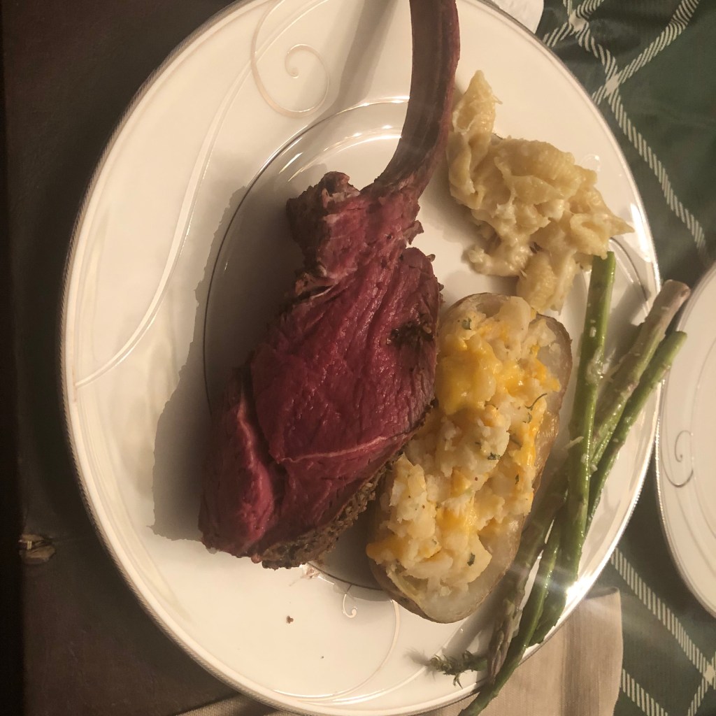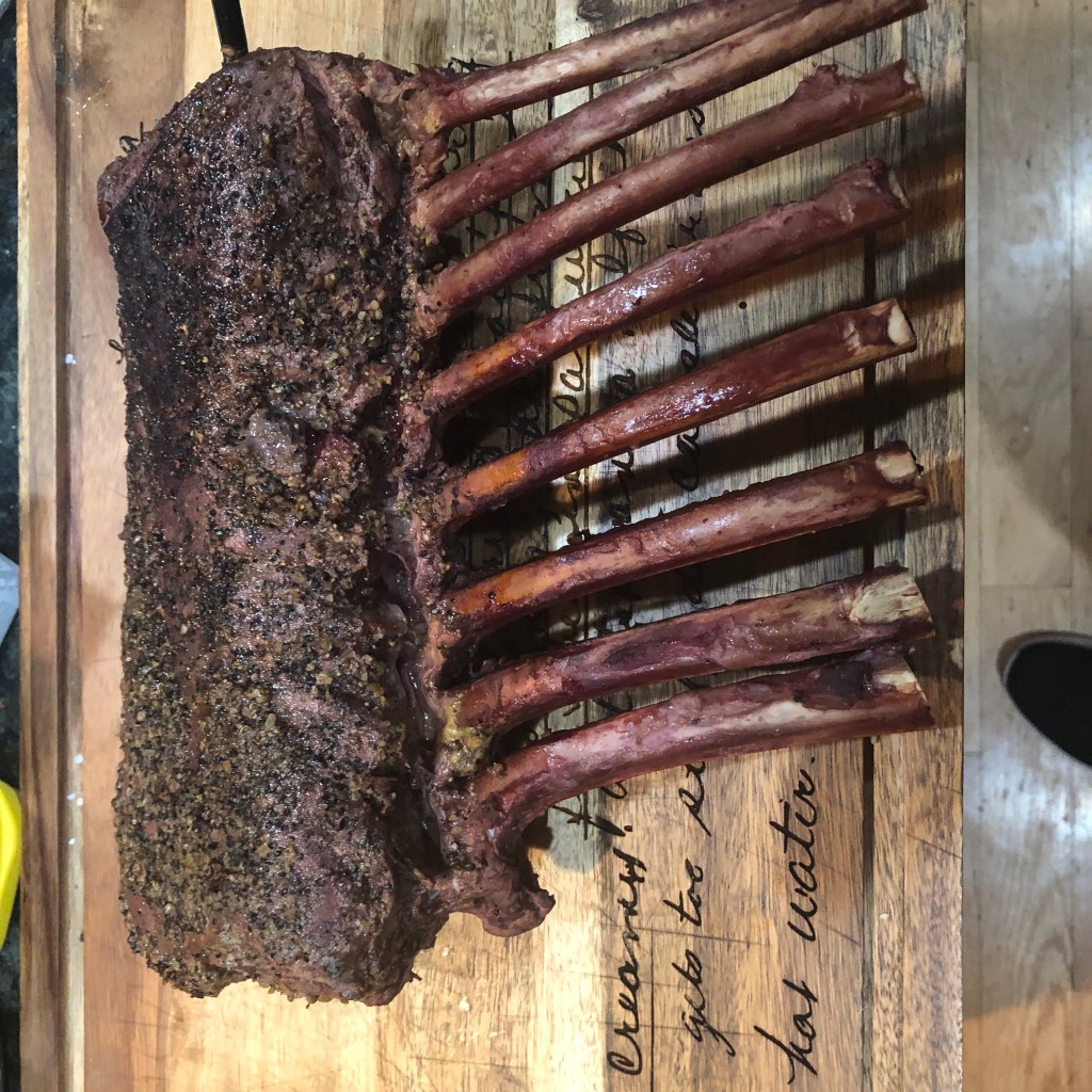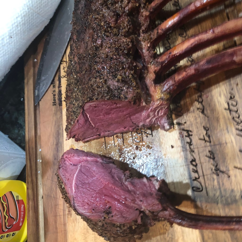 This was a memorable Christmas dinner. My instructions, my Son-in-Laws execution. I have never cooked an elk roast before and everyone gave it a thumbs up. A to Z meats had a 8 bone rib roast. I kept it simple with spices just Montreal steak seasoning. Then put in the smoker until the internal temp was 120. As you can see after the reverse sear the doneness was perfect. Even people who don’t like wild game gave it a thumbs up. I hope you like it.