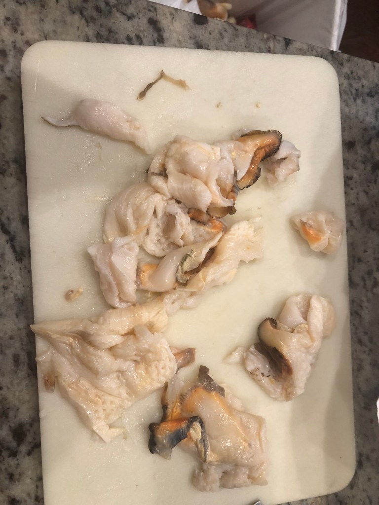 Pound out conch and other a meat mallet after removing foot. It’s chewy.