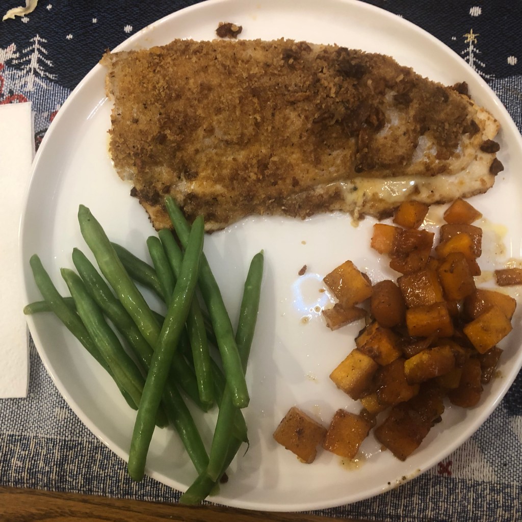 This got all confused, but it tasted great. I was trying to update Chicken Cordon Bleu and when I got done, it had nothing to do with Cordon Bleu. My first change was to ditch the chicken for rainbow trout. Then I upgraded the ham for smoky bacon which is always an improvement. Then I added blue cheese instead of the normal Swiss cheese which would have been lost next to the bacon. Lastly, I coated the whole thing in ground French fried onions; the simple seasoned flour would be boring with everything else going on. So it’s not Cordon Bleu. I hope you like it.
