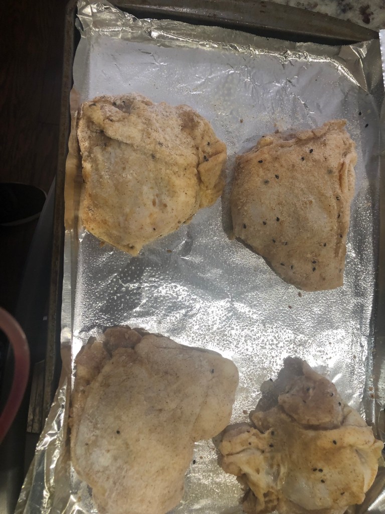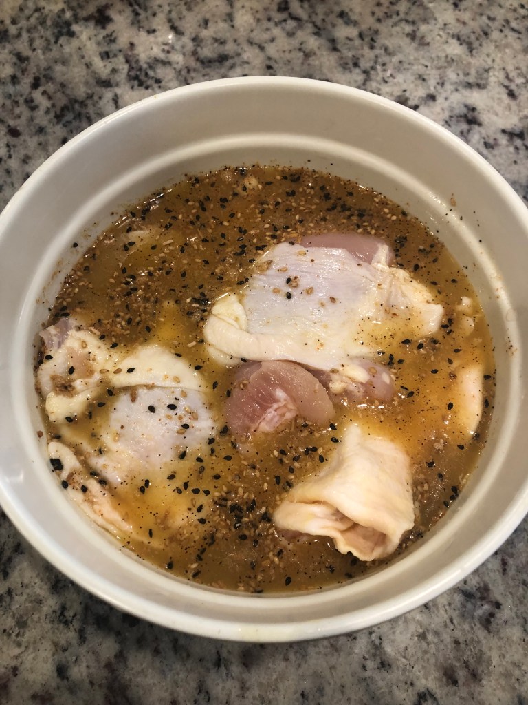 Asian flavors with coconut aminos, hoisin, 5 spice, Poppi’s Asian seasoning and gochugang. Then the chicken marinated in orange juice, oven fried with rice flour for crispy skin and just a little honey to tone down some of the heat. It has elements from China, Japan and Vietnam. I also snuck in some Louisiana creole spice to really confuse your taste buds. I hope you like it.