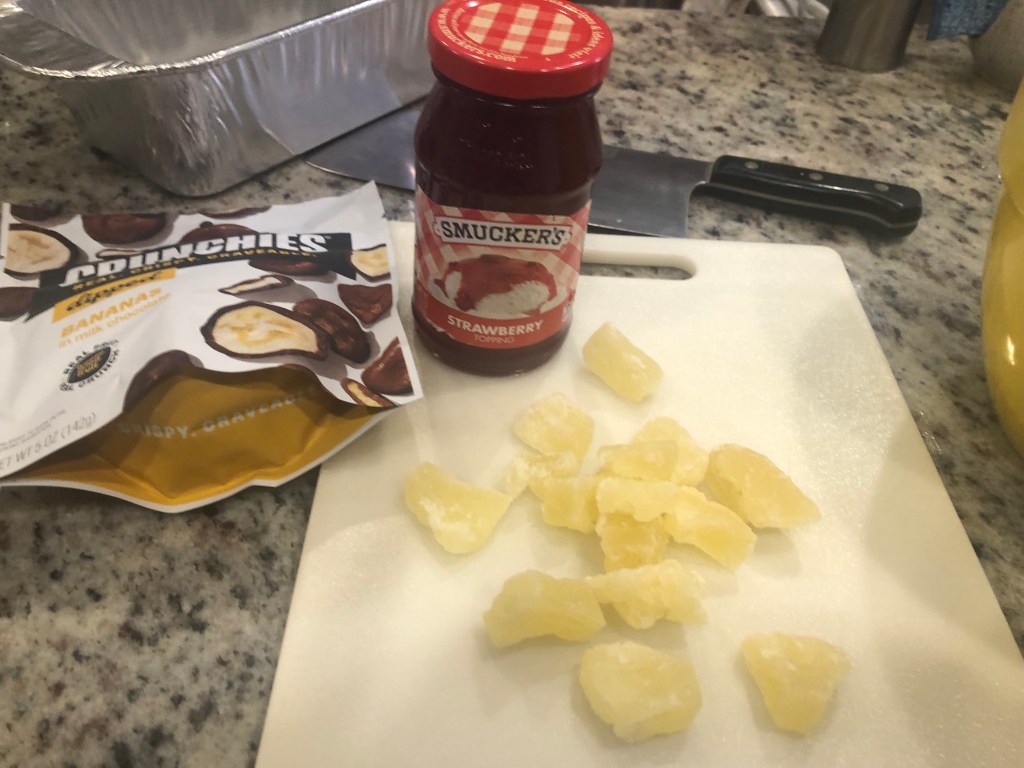 Add chocolate, chocolate covered bananas, pineapple pieces, mix.