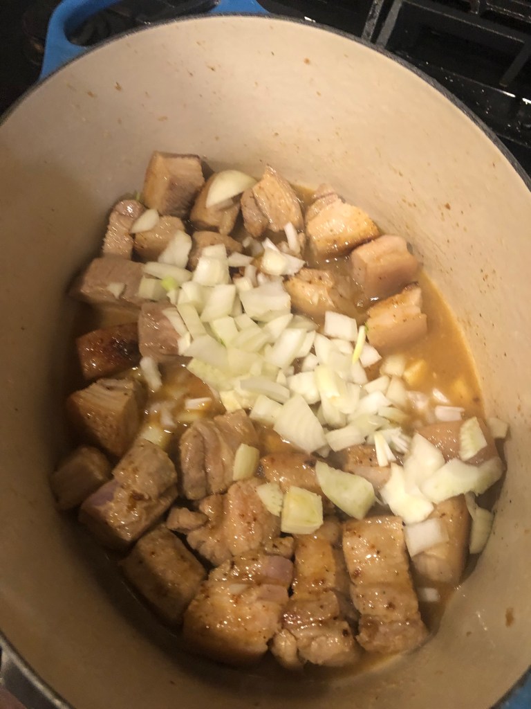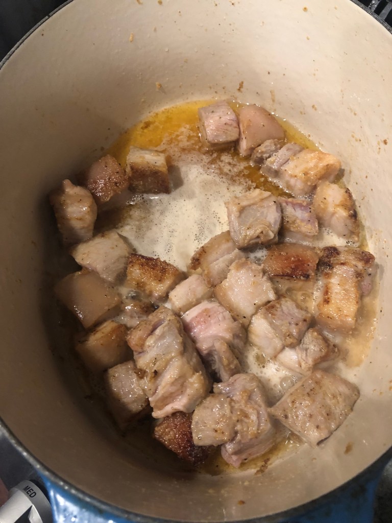 In a Dutch oven on the stove top on medium heat add porkbelly and brown.