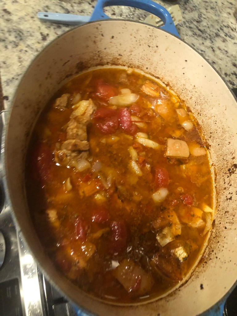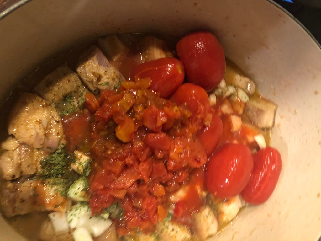 Pork belly is one of my favorite things to make. I have done a numbering of ways. This is r rich fatty dish with some spice. Fennel, onions and garlic make a great base for the dish. The spices bay leaf, cinnamon with lots of pepper almost North African in the almost stew. Tomatoes and veggie stock finish the dish. I hope you like it.