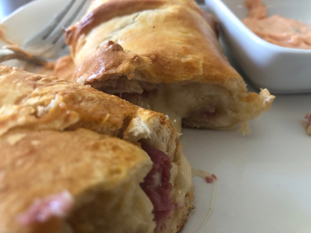 A few years ago I did a pizza roll which is the state dish of West Virginia. All the pizza ingredients all rolled up in pizza dough then baked to golden brown perfection. So I have put kimchi(which is my preferred sauerkraut, corned beef, Swiss cheese all rolled up in some crescent roll dough. I didn’t forget the thousand island dressing it’s on the side.