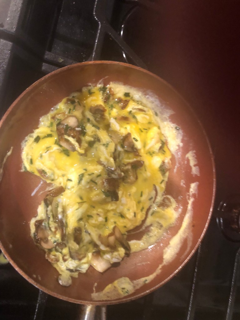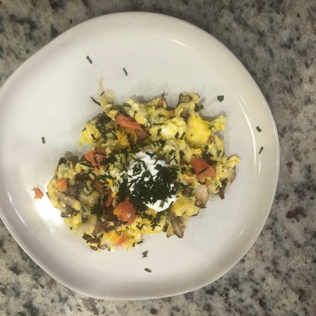 This is a simple weekend dish which can also be made bigger for a brunch. Lox , eggs, capers, crème fresh, local cheddar cheese, and chives. Salty, herbaceous, creamy a great way to start your day. I hope you like it.